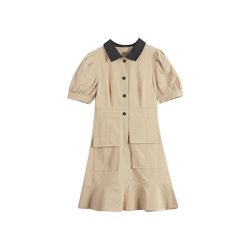 2021新款复古泡泡袖工装口袋收腰裙子女装夏季显瘦气质短袖连衣裙热门设计联盟服务商