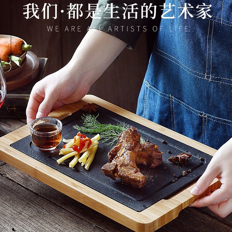 精品北美星级酒店竹木板岩牛排料理西餐盘复古黑石板隔热垫石盘托热门设计联盟服务商